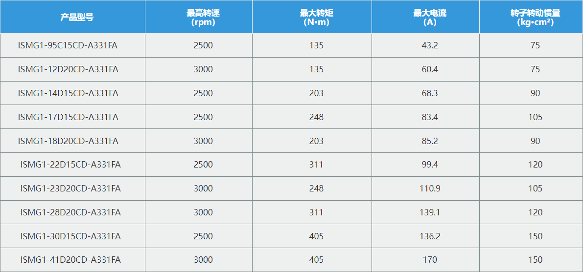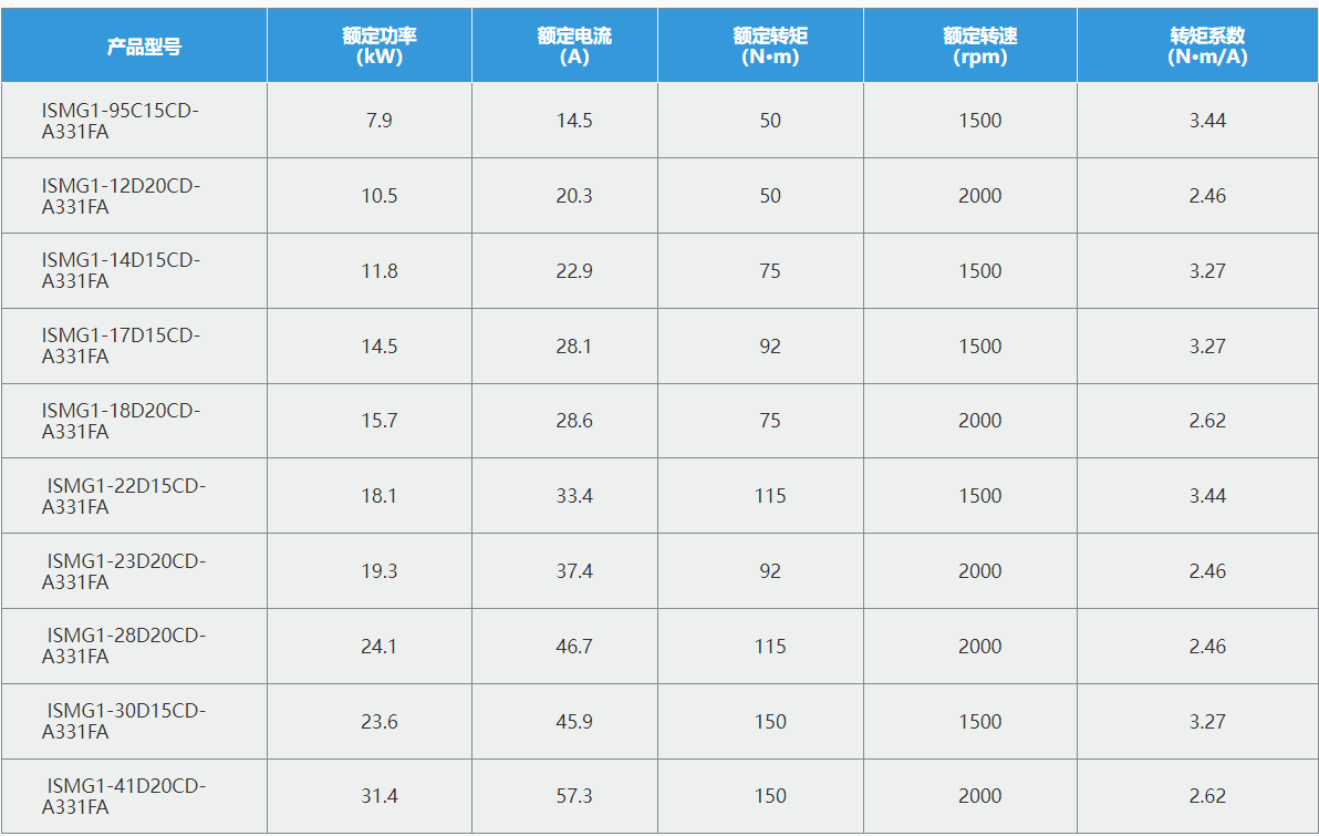 ISMG 系列伺服電機產品,功率覆蓋7.5 kW ~ 80 kW、標配23 位絕對值編碼器;產品的IP54 防護等級設計、耐沖擊振動的編碼器結構設計保證了產品可以覆蓋絕大多數工業場合的應用;獨特的電磁設計及風冷回路設計、內置熱保護器,實現了在產品在生命周期內高可靠性運行;ISMG1 系列亦可加裝150 N·m 制動扭矩的制動器。